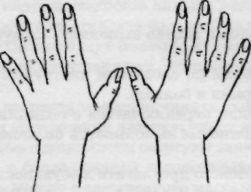 Исходное положение. Поставить ладони под углом друг к другу. Расположить пальцы одной руки между пальцами другой. Шевелить прямыми пальцами.