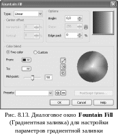 Градиентная заливка предназначена для заполнения внутренней части объекта плавно меняющимся цветом в выбранном направлении. Для создания градиентной заливки используют окно Fountain Fill (Градиентная заливка), показанное на рис. 8.13.