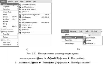 С помощью инструментов цветовой коррекции можно улучшить качество выделенных объектов, изменив их затененные и ярко освещенные участки. Эти инструменты особенно полезны при обработке растровых изображений, полученных при фотографировании с «неправильной» выдержкой, или для приведения цветов объектов в соответствие с другими объектами иллюстрации.