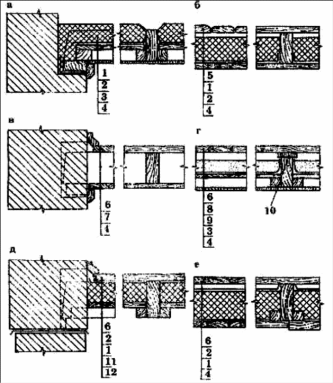Рис. 24. Фрагмент перекрытия по деревянным балкам: а — чердачное с «черным» потолком; б — чердачное с подшивным дощатым потолком и ходовым настилом; в — междуэтажное без звукоизоляции; г — междуэтажное с повышенной звукоизоляцией; д — цокольное с «черным» полом; е — цокольное с дощатой подшивкой: 1 — утеплитель; 2 — пароизоляция; 3 — «черный» потолок; 4 — подшивка; 5 — ходовой настил; 6 — доски пола; 7 — балка; 8 — сухой песок; 9 — подстилка; 10 — упругая подкладка; 11 — «черный» пол; 12 — черепной брусок.