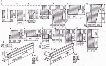 Рис. 58. Ригели каркасов: I – сечения; II, III – общие виды: а – парный прямоугольного сечения; б – одиночный прямоугольного сечения; в – тавровый; г, д – рядовые ригели в виде перевернутого тавра; е, ж, и, к, л – варианты фасадных ригелей; м – коридорный ригель; н, о, п – варианты лестничных ригелей.