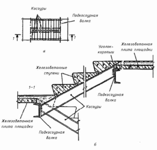 б) лестницы из отдельных каменных или железобетонных ступеней по стальным косоурам;