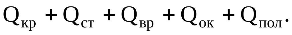 Потери тепла через стены, окна, двери, пол и кровлю определяются из выражения Q, Вт,