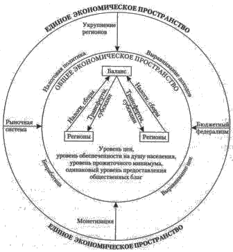 Единое экономическое пространство — это единая структура национальной экономики. Внутри этой структуры каждый элемент зависит от структуры совокупности и законов, ею управляющих, с одной стороны, с другой стороны — это взаимозависимость и интеграция этих элементов, которые не приобретают смысла иначе как один посредством другого. Так, например, происходит взаимодействие рынка и государства в пространстве. Можно сказать, что рыночные и государственные процессы происходят и движутся друг относительно друга в пространстве.
