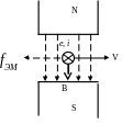 Взаимодействие этого тока с Магнитным Полем приводит к появлению Электромагнитной силы, направленной против движения проводника. Направление этой силы определяется по правилу левой руки.