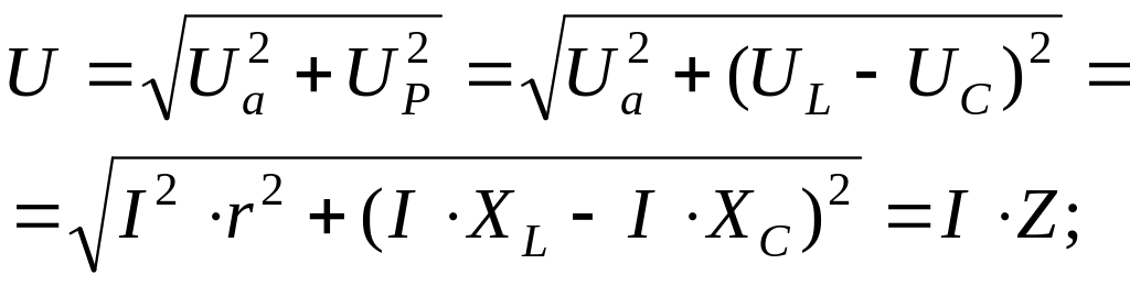 10. Неразветвленная цепь переменного тока с r, L, и C. Векторная диаграмма для случая XL > XC .Закон Ома. Треугольники напряжений и сопротивлений.
