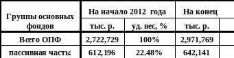 В 2012 году стоимость основных фондов увеличилась на 249 040 тыс. руб. (109,1%). Наибольшими темпами выросли машины и оборудование (рост составил 13,6%). Машины и оборудование занимают наибольший удельный вес, равный на конец года 50,89%. Темп роста активной части основных фондов (110,4%) превышает темп роста пассивной части (104,9%), это положительно влияет на технологическую структуру основных фондов.