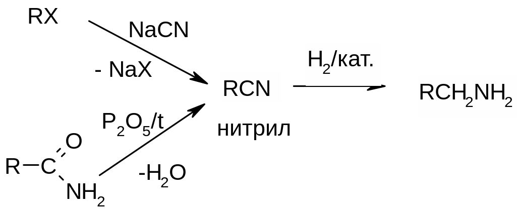 восстановление нитрилов (органических соединений с цианогруппой). Нитрилы получают из доступных галогенуглеводородов или амидов.
