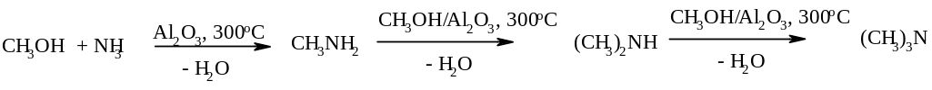 1) Алкилирование аммиака спиртами. В присутствии кислотных катализаторов (серная кислота или оксиды, например Al2O3) осуществляется замещение ОН-группы спирта на аминогруппу. Так, метиламины получают из метанола и аммиака под давлением на оксиде алюминия. Обычно образуется смесь всех трех аминов. В избытке спирта она обогащена третичным амином, а в избытке аммиака – первичным.
