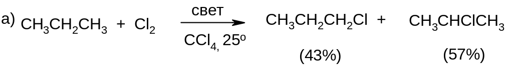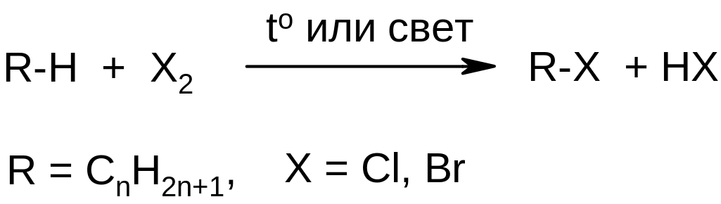 3) Реакции замещения – радикальное хлорирование и бромирование. Протекают при действии хлора или брома на алкан на свету или при нагревании: |