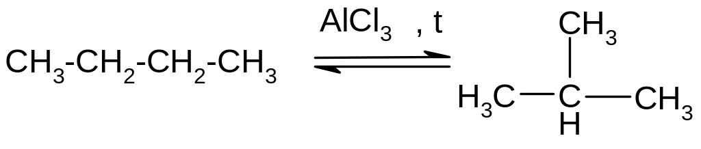7) Реакции изомеризации. Под действием кислот Льюиса (например, AlCl3, AlBr3) при повышенной температуре н-алканы частично превращаются в изоалканы. В итоге образуется равновесная смесь н-алкана и алканов изостроения: