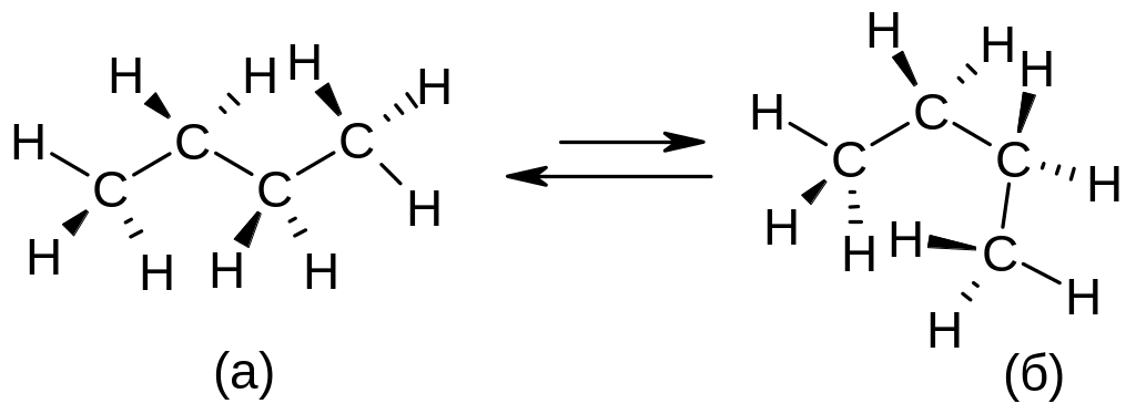 Различные пространственные формы (конформации) молекулы алканов могут принимать при вращении вокруг простых С-С связей1; число конформаций бесконечно велико. Две из них для молекулы бутана (а – более выгодная заторможенная и б - менее выгодная заслоненная) показаны на рисунке. |