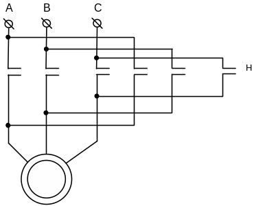 Либо динамическое торможение достигается, когда статор электродвигателя отключается от сети, а две (любые) его фазы подключаются на постоянное напряжение.
