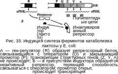 Лактозный оперон Е. coli, состоящий из трех структурных генов, промотора и оператора, был первой ферментной системой, на которой Ж. Моно и Ф. Жакоб изучали механизм индукции синтеза ферментов.