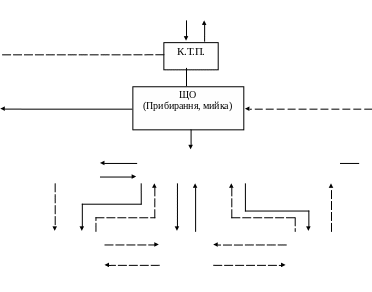 Під технологічним процесом виробництва розуміється послідовність технічних впливів на автомобіль, на АТП. На КТП здійснюється інвентарний і технічний прийом автомобілів з лінії й оформляється документація. Потім автомобілі в зоні ЩО проходять прибирально-мийні роботи і заправляються олією і водою. Далі всі несправні автомобілі направляються в зону збереження, а якім потрібно ТО і ремонт, у відповідні виробничі зони, після чого в зону збереження. Якщо кількість автомобілів, що повертаються з лінії в одиницю часу більше пропускної здатності зони ЩО, то частина автомобілів після КТП надходить у зону збереження або чекання ТО, і проходять ЩО, коли вона не буде завантажена.