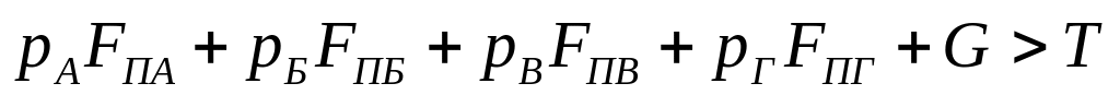 Бұл жерде рА, рБ, рВ, рГ – сәйкес қуыстардағы сұйықтың қысымы; FП- әрбір белгіленген қуыстағы поршендердің диаметральді проекциясының пайдалы ауданы; G - поршенді топтың ауырлық күші; T - поршеньді топқа әсер ететін үйкеліс күші.