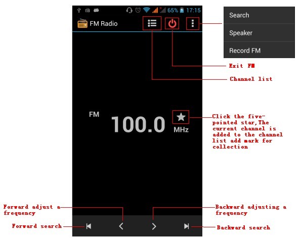 Through this program, you may listen to FM radio on the device, FM radio use the wired headset as an antenna to receive signals, before opening this program ,you can install the original equipment-headphones, when listening, you can switch it manually to speakers or the mode with wired headphones.