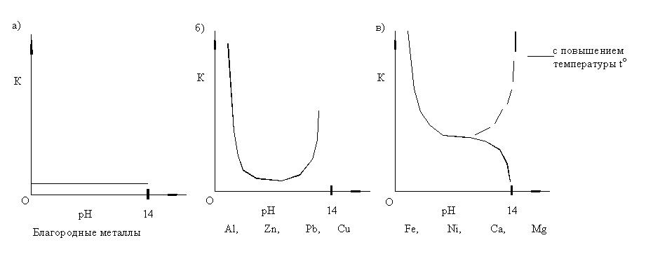 Рисунок 11.13. Типичные зависимости интенсивности коррозии отдельных групп металлов от рН.