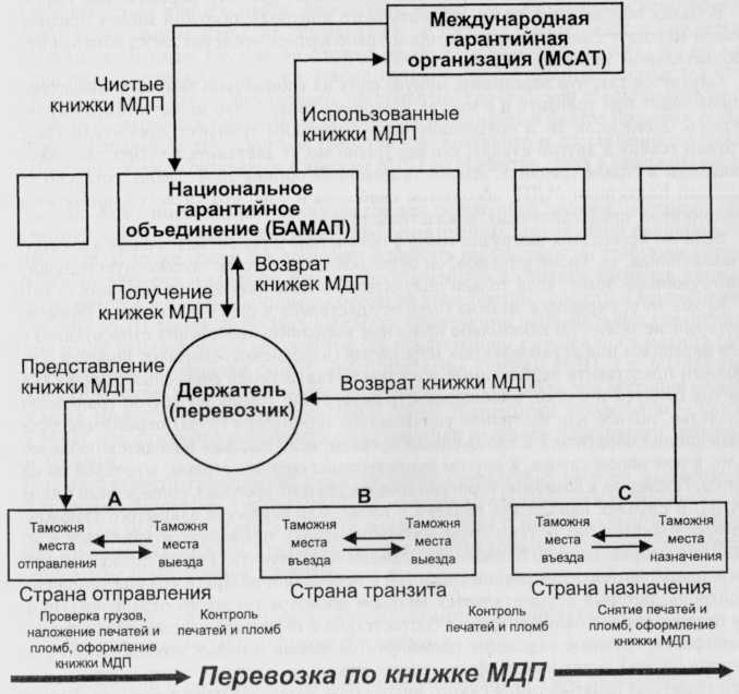 Процедуры таможенного контроля системы МДП схематично показаны на рисунке 1. Таможня места отправления, обычно являющаяся тем органом, где выполняются экспортные формальности, досматривает груз на основе информации, указанной в книжке МДП, заполненной перевозчиком и грузоотправителем. Таможенный орган накладывает пломбу на грузовое отделение транспортного средства и описывает ее в графе 16 на всех оформленных грузоотправителем листах книжки МДП, оставляет у себя отрывной лист №1 (белый) и заверяет соответствующий корешок, в котором указывается, где, когда и кем было произведено изъятие оформленного отрывного листа. Книжка МДП возвращается перевозчику, который приступает к выполнению транспортной операции. При пересечении границы в пункте выезда из этой страны таможенный орган проверяет печати и пломбы, изымает из книжки МДП отрывной лист №2 (зеленый) и заверяет соответствующий корешок. Транспортное средство может выехать из страны, а оба заверенных таможенных корешка позволяют считать, что в этой стране операция МДП была выполнена надлежащим образом.
