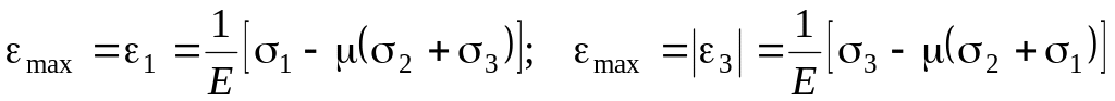 Максимальные относительные деформации согласно обобщенному закону Гука определяются при растяжении и сжатии соответственно по зависимостям: