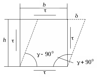 При чистом сдвиге в окрестности точки можно выделить элементарный параллелепипед с боковыми гранями, находящимися под действием одних лишь касательных напряжений.