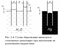 Силы взаимодействия между молекулами жидкости и молекулами стенки вызывают на поверхности жидкости дополнительное давление. Это давление обусловлено силами поверхностного натяжения и для выпуклой поверхности оно положительно и направлено во внутрь жидкости, для вогнутой поверхности – отрицательно и направлено в противоположную сторону. В результате при вогнутом мениске жидкость под действием разности давлений на поверхности сосуда и на поверхности мениска будет подниматься в капилляре на высоту h (рис. 2.4). При выпуклом мениске жидкость наоборот – будет опускаться в капилляре. Физическое явление, заключающееся в способности жидкостей изменять уровень в трубках, узких каналах произвольной формы, пористых телах, называется капиллярностью (от лат. capillaris — волосяной).