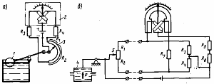 Принципиальные схемы электрических уровнемера (а) и манометра (б) с реостатными датчиками