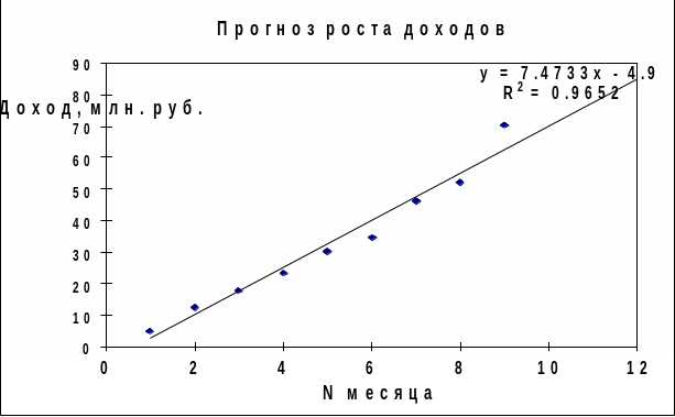 Построение регрессионной зависимости производится в два этапа. На первом этапе строим XY - диаграмму ( X - независимая переменная - номер месяца N, Y - зависимая переменная - доход, млн. руб.). Выделить таблицу (без первого столбца с подписями), щелкнуть по кнопке Мастер диаграмм, указать место и размеры прямоугольной области (можно на том же листе), выделяемой под диаграмму (см. раздел “Использование графических возможностей EXCEL”).