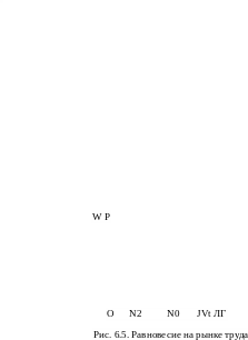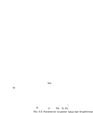 Равновесие на рынке труда совпадает с полной занятостью. На рис. 6.5 предложение труда полностью соответствует спросу на него при ставке реальной заработной платы W/P0. Если заработная плата поднялась до уровня W/P1 , то предложение труда возрастает до N1, работу будут искать трудоспособные, представленные отрезком N0N1; спрос на труд сократится до N2. В результате безработица составит N2 — N1.