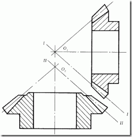 Приемы установки и закрепления колес в конических передачах аналогичны приемам установки и закрепления цилиндрических зубчатых передач. Но при сборке конических передач следует помнить, что зацепление колес правильное тогда, когда оба колеса будут установлены в такое положение, при котором образующие начальных конусов (I–I и II–II) совместятся, а предполагаемые центры конусов (О и О1) совпадут (рис. 63).