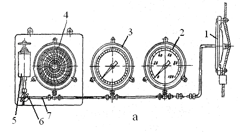 1-қысым трансформаторы, 2-негізгі көрсеткіш, 3-верньерлік көрсеткіш, 4-тіркеуші прибор,5 -пресс-бак, 7-мыс түтік