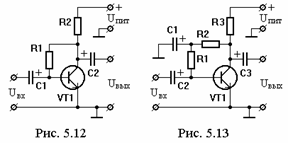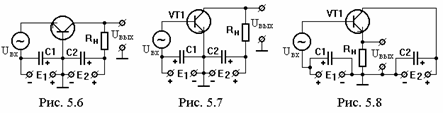 В усилителях на биполярных транзисторах используется три схемы подключения транзистора: с общей базой (рис. 5.6; 5.9), с общим эмиттером (рис. 5.7; 5.10), с общим коллектором (рис. 5.8; 5.11).