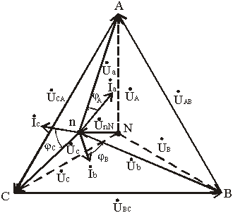 При несимметричной нагрузке Za ≠ Zb ≠ Zc между нейтральными точками приемника и источника электроэнергии возникает напряжение смещения нейтрали UnN.