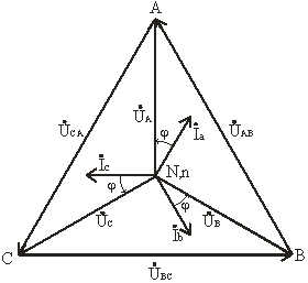 При симметричной нагрузке, когда Za = Zb = Zc = Zφ, напряжение между нейтральной точкой источника N и нейтральной точкой приемника n равно нулю, UnN = 0.