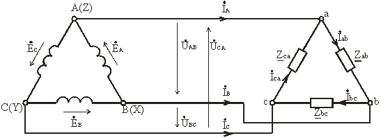 Пренебрегая сопротивлением линейных проводов, линейные напряжения потребителя можно приравнять линейным напряжениям источника питания: Uab = UAB, Ubc = UBC, Uca = UCA. По фазам Zab, Zbc, Zca приемника протекают фазные токи İab, İbc и İca. Условное положительное направление фазных напряжений Úab, Úbc и Úcaсовпадает с положительным направлением фазных токов. Условное положительное направление линейных токов İA, İB и İC принято от источников питания к приемнику.