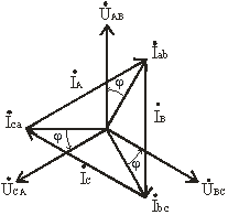 На векторной диаграмме (рис. 3.14) фазные токи отстают от фазных напряжений на угол φ (полагаем, что фазы приемника являются индуктивными, т.е. φ > 0°). Здесь принято, что напряжение UAB имеет нулевую фазу. Из диаграммы следует, что любой линейный ток больше фазного в раз. Линейный ток İA отстает по фазе от фазного тока İab на угол 30°, на этот же угол отстает İB от İbc, İC от İca.