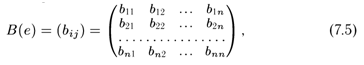 Справедливо следующее утверждение: любую билинейную форму можно представить в виде суммы симметричной и кососимметричной билинейных форм (см. п. 1 §9 гл.5). 2. Представление билинейной формы в конечномерном линейном пространстве. Пусть в n-мерном линейном пространстве L задана билинейная форма В(х, у). Выясним вопрос о представлении формы В(х, у) в случае, когда в L задан определенный базис е = (е1, е2,..., еn). Справедливо следующее утверждение. Теорема 7.1. Билинейная форма В(х, у) при заданном в n-мерном линейном пространстве L базисе е =(е1, е2,..., еn) может быть однозначно представлена в следующем виде: