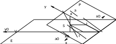 Часто при трансформировании наклоняют не снимок Р, а экран Е, или наклоняют и снимок Р и экран Е. Следует заметить, что зависимость между координатами не нарушится, если изменить угол между плоскостями P и E, сохраняя стороны параллелограмма (Рис.48)