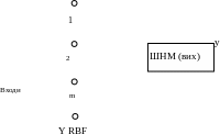 Входами нейромережі RBF є x1, x2, x3. Наступним є шар нейронних елементів з гаусівськими функціями активації, кожен з нейронів відповідає центру радіальної функції. Кожен центр визначається своїми координатами (x1і, x2і, … x3і) у випадку, якщо вхідний вектор співпадає з координатам центру, то на виході нейронного елемента маємо сигнал 1.