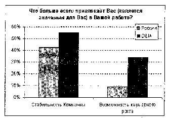 На вопрос «Что больше всего привлекает вас в вашей работе?» 42 % сотрудников отвечают «Стабильность» и только 9 %- «Перспективы развития и роста». Подобная ситуация наблюдается не только в России, но и в США: по данным исследований, проведенных SHRM в 2005 году, стабильность занимает 5-е место (55 %) по значимости (после оплаты труда, benefits Job security и work-life balance), в то время как перспективы роста - 15-е место (34%),