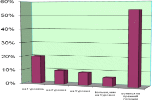 Результаты исследований выявили следующую картину: в целом практически половина опрошенных сотрудников за время работы в организации выросли как минимум на одну позицию, 22 % работников выросли на 1 уровень, 12 % - на 2 уровня, а еще 12 % удалось вырасти на 3 и более уровня.