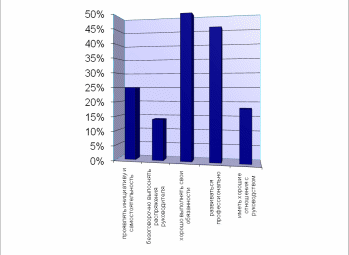 Приблизительно так же опрошенные сотрудники ценят возможность принятия самостоятельных решений, данный фактор стоит почти на предпоследнем месте. Это означает, что деятельность сотрудников сильно формализована, или они просто не находят сферы, в которой могли бы проявить все свои качества.