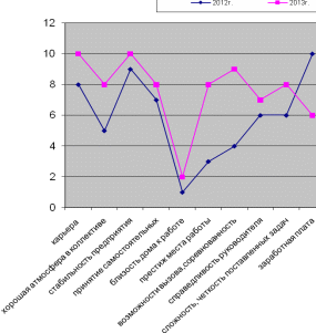 Особенностью анкетирования в январе 2013 года можно отметить такую черту: никто из сотрудников предприятия не смог четко проранжировать 10 приоритетов, один и тог же балл выставлялся нескольким критериям.