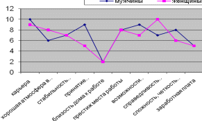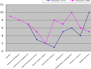 Как видно на рисунке 16, у мужчин-корреспондентов по истечении года сохранили свои позиции такие факторы как карьера, близость дома к работе и соревновательность. Остальные факторы, такие как стабильность предприятия, самостоятельность в принятии решений, справедливость руководства существенно набрали баллы. Фактор денег в течение года опустился на предпоследнее место по значимости.