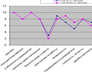Как видно из рисунка 18, у сотрудников со стажем работы до 3-х месяцев в течение гола сохранили позиции такие факторы, как карьера и возможность вызова. Остальные факторы существенно набрали баллы. Фактор денег у новых сотрудников по-прежнему остается в лидирующих.