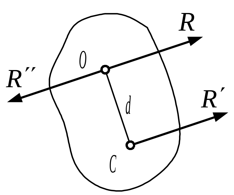 б) R≠0, МO≠0. В этом случае пару с моментом МO можно изобразить двумя силами R' и R", беря R'=R, a R"= – R (рис. 10, б). При этом, если d=OC – плечо пары, то должно быть
