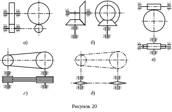 Условные изображения передач на схемах приводов: цилиндрическая зубчатая передача – рисунок 20, а; коническая зубчатая передача – рисунок 20, б; червячная передача – рисунок 20, в; клиноременная передача – рисунок 20, г; цепная передача – рисунок 20, д; М – электродвигатель.