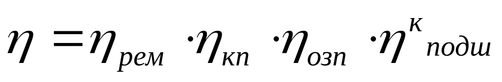 По таблице 13 КПД ременной передачи рем= 0,96; КПД конической передачи кп= 0,97; КПД открытой зубчатой передачи озп= 0,95 КПД; одной пары подшипников качения подш= 0,99. Число пар подшипников качения к, определяется по количеству валов в приводном механизме, в нашем случае к = 3.