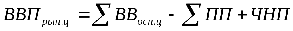 Суть производственного метода состоит в вычислении ВВП суммированием ВДС по отраслям (секторам) экономики. Позволяет охарактеризовать структуру ВВП с точки зрения отраслей (секторов) экономики и оценить их вклад в производство. В рыночных ценах ВВП рассчитывается по формуле:
