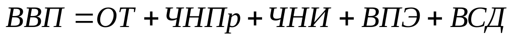 Определяется как сумма первичных доходов, распределённых экономическими единицами между производителями товаров и услуг. К таким первичным доходам относятся: - оплата труда наёмных работников (ОТ); - чистые налоги на производство (ЧНПр); - чистые налоги на импорт (ЧНИ); - валовая прибыль экономики (ВПЭ); - валовые смешанные доходы (ВСД)